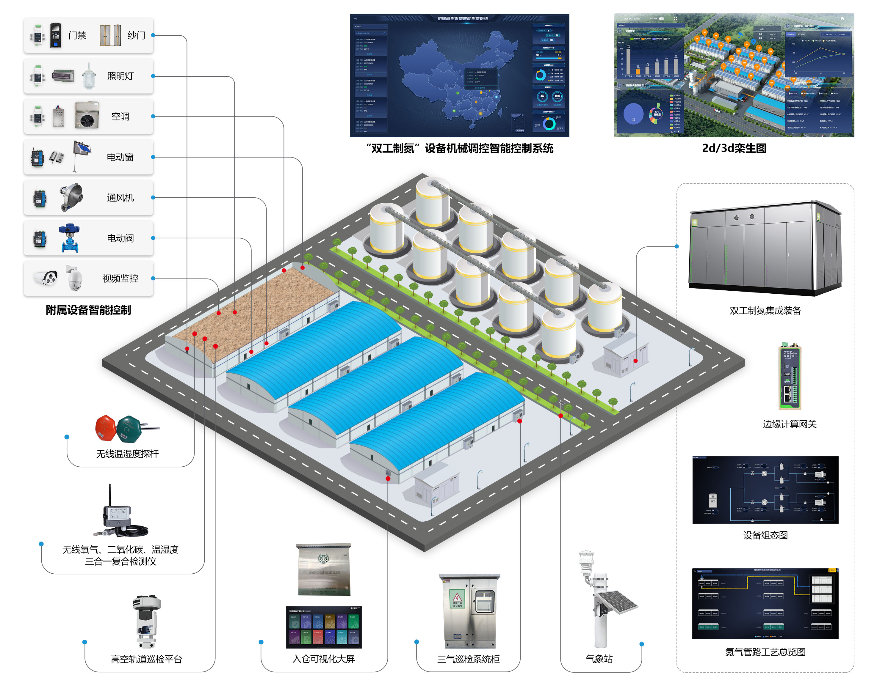 - 聚焦氮气气调储粮智能管控需求,深度融合物联网、边缘计算、三维可视化等新一代信息技术,构建粮库集成装备智能控制系统,实现储粮作业全流程数字化、智能化管控。
